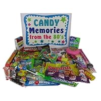 A box of nostalgic candy that was popular in the 1980's makes a great gift idea!Includes: Bubble Tape, Laffy Taffy, Jolly Rancher Stick, Ring Pop, Big League Chewing Gum, Swedish Fish, Sour Patch Kids, Airheads, Razzles, Candy Lipstick, Root Beer Barrels, Pop Rocks, Smartie Pops, Zotz, Pixy Stix, Starburst, Skittles, Tootsie Pop, Saf-T-Pop, Candy Cigarettes, Lemonheads, Sugar Daddy Pop Jr., Atomic Fireballs, Tootsie Rolls, Smarties, Juicy Fruit Gum, Gobstoppers, Mary Janes, Necco Wafers, Gummy Bears, Now & Later, Dubble Bubble Gum, Candy Buttons on Paper, Strawberry Twizzler, Black Taffy, Bit-O-Honey, Chick-O-Stick, Push Pop, Fun Dip, and a Candy Necklace.Comes shrink wrapped in our Nostalgia Candy Memories From the 80's box.